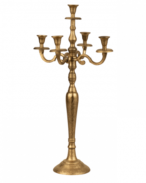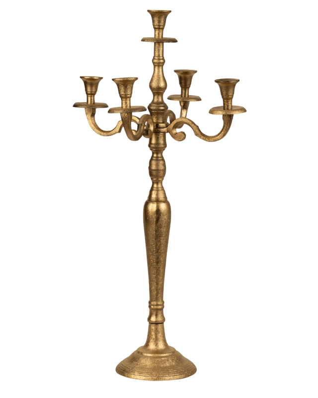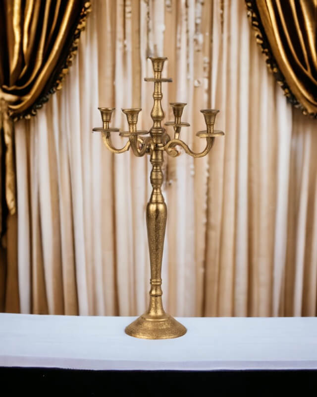 Dieser Kerzenständer ist mit einer goldfarbenen Metall-Legierung versehen und bringt einen Hauch von Eleganz für Ihren Event und Veranstaltung. Mit einer Höhe von 80 cm ist dieser Kerzenleuchter ein beeindruckendes Dekorationselement. Der Kerzenleuchter ist 5-armig und bietet Platz für mehrere Kerzen gleichzeitig. Er hat einen stabilen Fuß (ca. Ø 18 cm), was für zusätzliche Sicherheit sorgt. Der Kerzenständer kann mit handelsüblichen Stabkerzen Ø 2,2 cm bestückt werden, was Ihnen die Auswahl der Kerzen erleichtert.