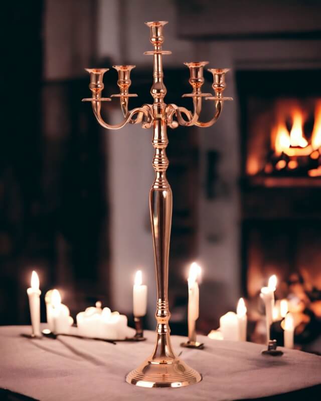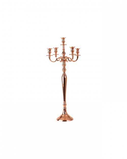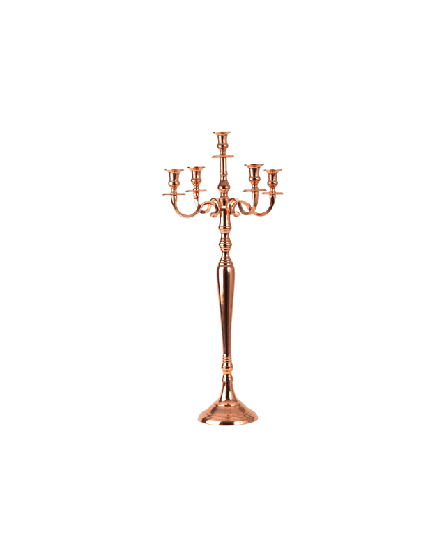 Dieser Kerzenständer ist mit einer rosefarbenen Metall-Legierung versehen und bringt einen Hauch von Eleganz für Ihren Event und Veranstaltung. Mit einer Höhe von 80 cm ist dieser Kerzenleuchter ein beeindruckendes Dekorationselement. Der Kerzenleuchter ist 5-armig und bietet Platz für mehrere Kerzen gleichzeitig. Er hat einen stabilen Fuß (ca. Ø 18 cm), was für zusätzliche Sicherheit sorgt. Der Kerzenständer kann mit handelsüblichen Stabkerzen Ø 2,2 cm bestückt werden, was Ihnen die Auswahl der Kerzen erleichtert.